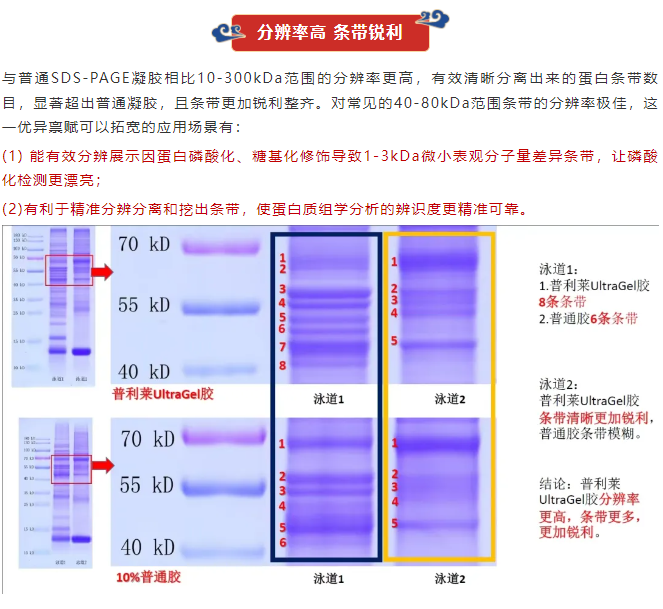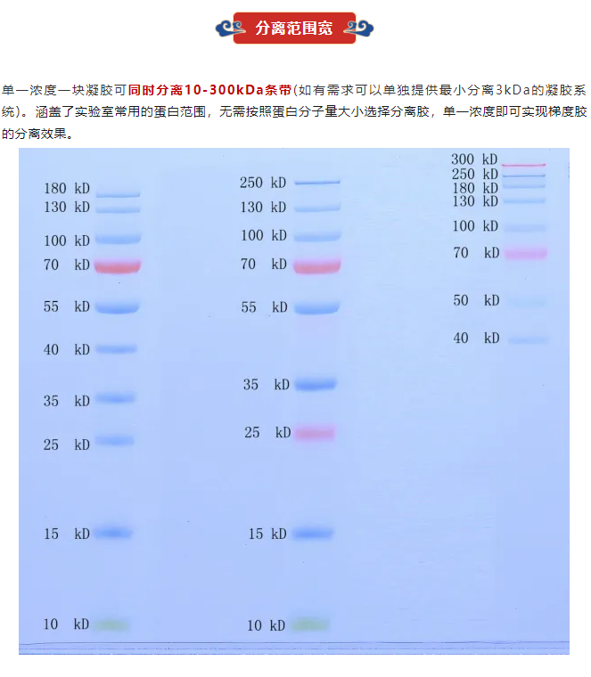 普利萊深挖SDS-PAGE蛋白凝膠電泳基本理論結(jié)合既往產(chǎn)品實(shí)踐經(jīng)驗(yàn),經(jīng)研發(fā)優(yōu)選,全新推出可以同時(shí)分離10-300kDa寬范圍大小條帶、分辨率高、電泳速率快的通用系統(tǒng),即UltraGel寬范圍高分辨配膠試劑盒,與常規(guī)配膠試劑盒相比具有以下特征: